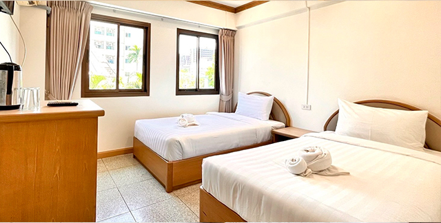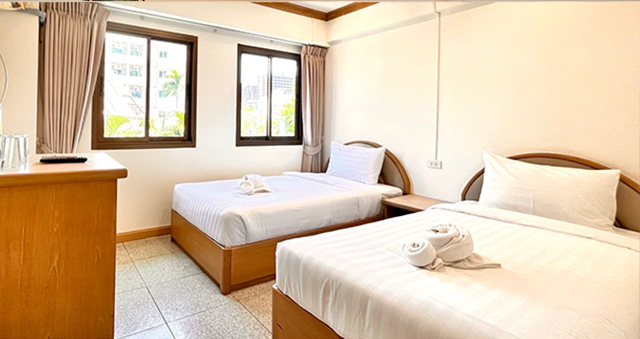 ห้องพักราคาสุดชิลล์ ณ ใจกลางเมืองพัทยา ที่มีสิ่งอำนวยความสะดวกอย่างครบครัน มาพร้อมกับทีวีขนาด 32 นิ้ว ตู้เสื้อผ้า ตู้เย็น อุปกรณ์ชงชา กาแฟ และ Wi-Fi ภายในห้องพัก